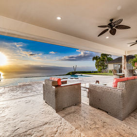 The Great Room remains one of the home’s most unforgettable features. Folding pocket doors, with new glass, open wide to the covered lanai, creating a sweeping indoor–outdoor living experience and framing the panorama of the island of Lanai floating in the distance.