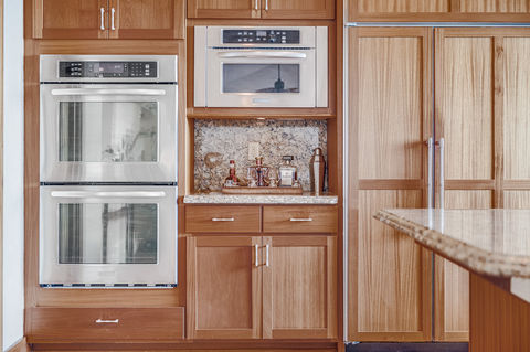 The kitchen is equipped with top-tier appliances, custom wood cabinetry, and a large bay window positioned to capture the dramatic vista. A substantial center island offers both workspace and a relaxed gathering spot.